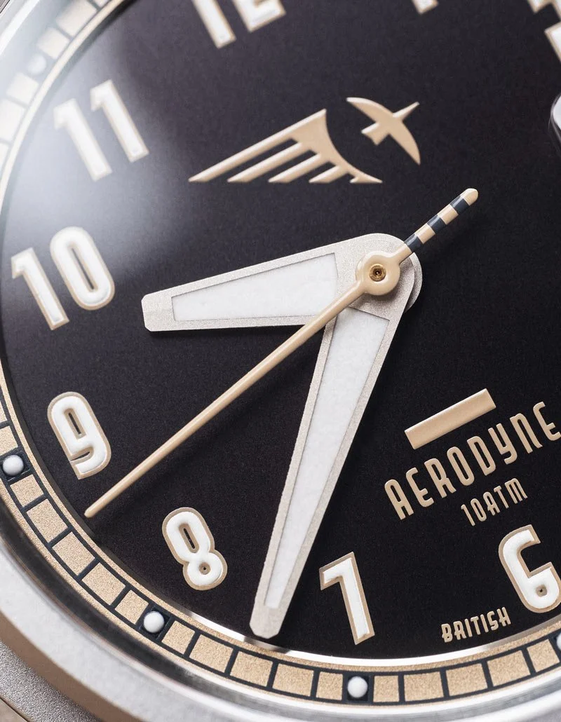 Subtle use of sandy tones, a dark grey/brown vertically brushed dial and shimmering golden-tan accents, this isn’t just another dial, it’s another dimension of Aerodyne.