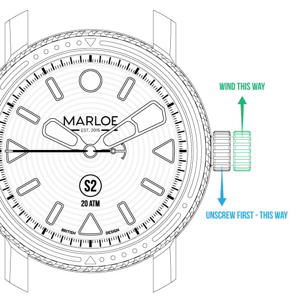 You must first unscrew the crown from its thread (a preventative measure for water resistance). Once it’s unscrewed all the way, you can wind away and enjoy.