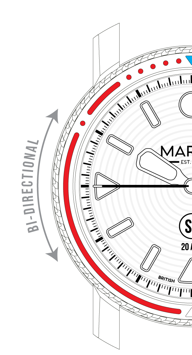Turning both clockwise and anti-clockwise, the bezel on the Sceptre S2 clicks 60 times - once per minute - and features a brand new etched and paint-filled scale; a central arrow leads on to 5 singular minute dots: the Regatta counter.