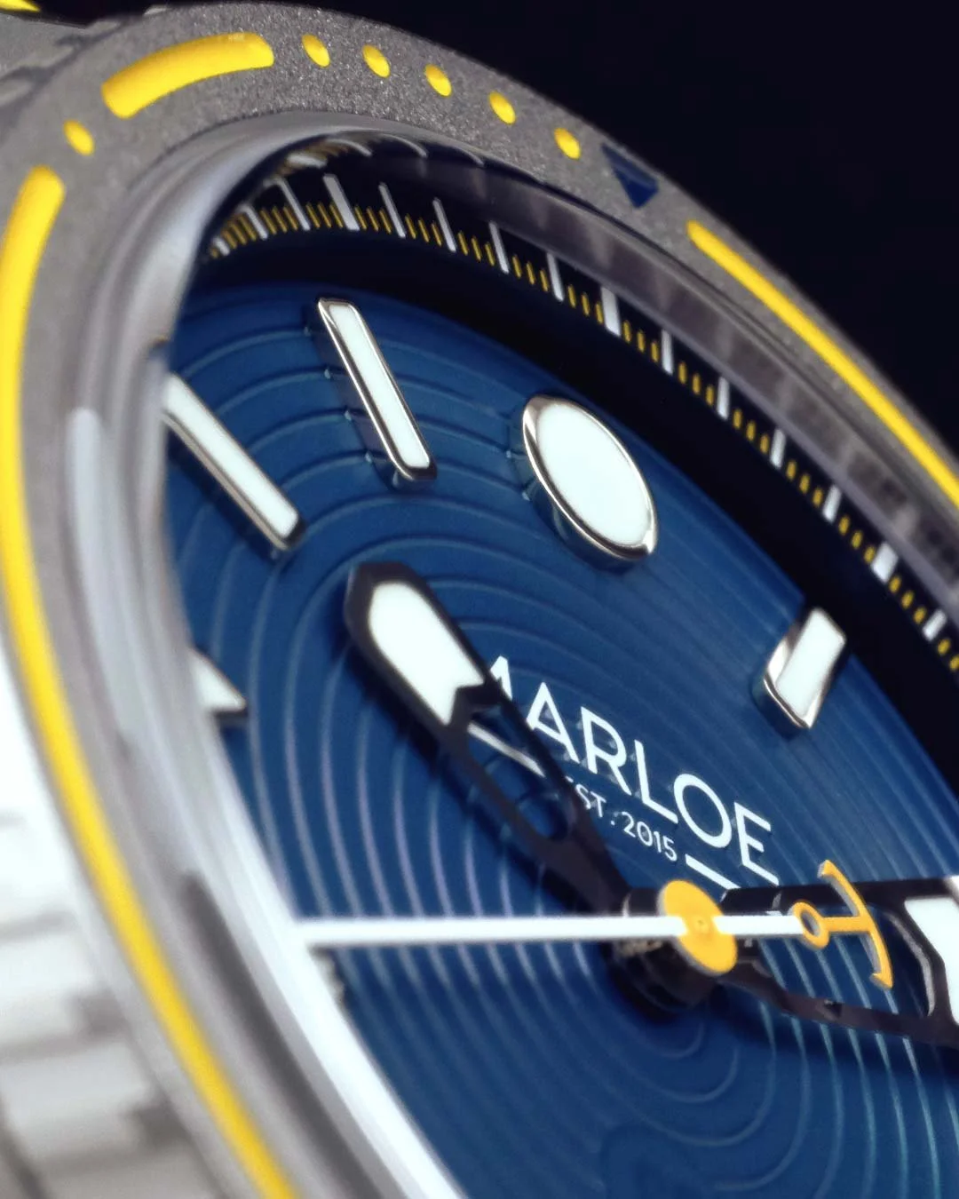 A faded navy blue dial with radiating textural lines leads to a raised darker blue ring, upon which golden yellow and white markings are printed. Polished applique around the dial are unmistakable in their radiation symbol shapes, and with the outwards bezel featuring full golden yellow paint fill, this is an evocative colourway that feels like it belongs in another world.