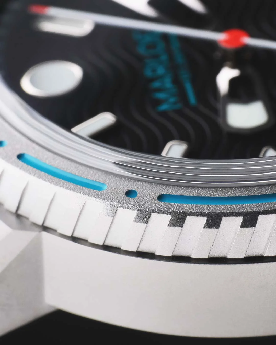 A black dial with our new wave-texture is home to new polished applique, with a raised black chapter ring with teal and white printed markings. It’s a clean dial. Outboard is our bi-directional bezel with two-tone paint fill, in both aquamarine and blazing red, matching the accents on the dial and anchor counterweight for the seconds hand.